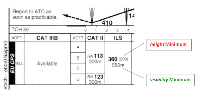 In the example shown above, if an ILS approach is being flown, the pilot can continue the approach below a height of 300 m only if the reported visibility is at least 550 metres.